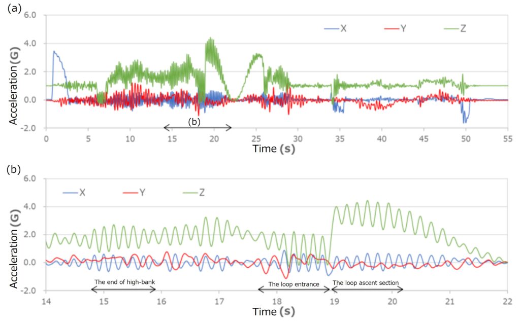 図7 (a) 全走行時間に対する新ホイールキャリア車両2両目における加速度の測定結果、(b) (a)中矢印で示された領域の拡大図[1]