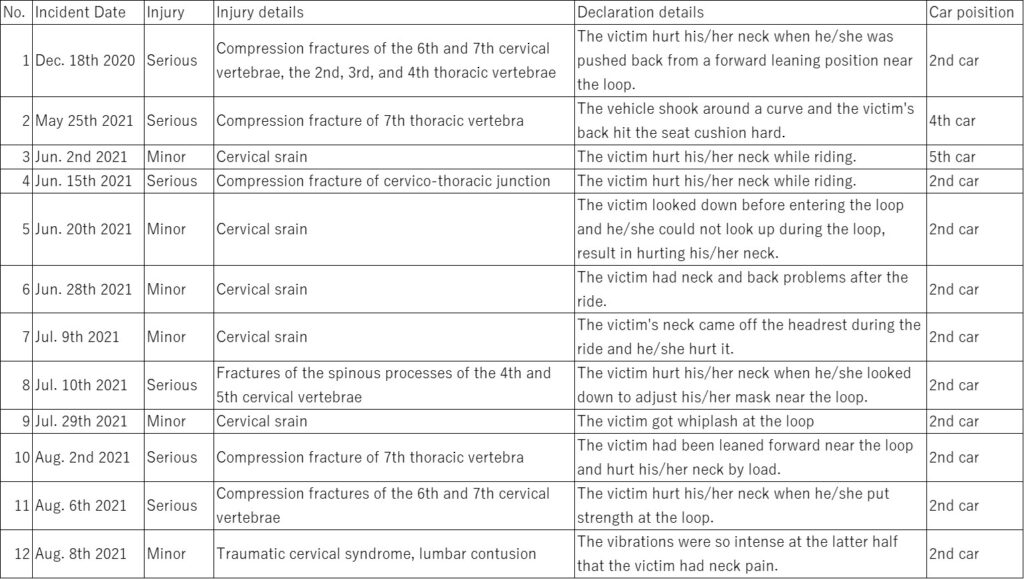 ホイールを変更して以降に、乗車時に重傷を負う人が相次いだことで、調査が行われることになりました。発端になったのは、2020年12月に頸椎及び胸椎の圧迫骨折を負った方から報告があったことです。その後、2021年の5月、7月、8月に骨折を伴う重傷者が発生しました。これを受けて、富士急ハイランドは2021年8月21日に相談窓口を開設。2021年10月20日までの2か月間に、前記4件を除いて、合計176件の申し出がありました。このうち、ド・ドドンパまたはドドンパに関係するものは、141件です[6]。