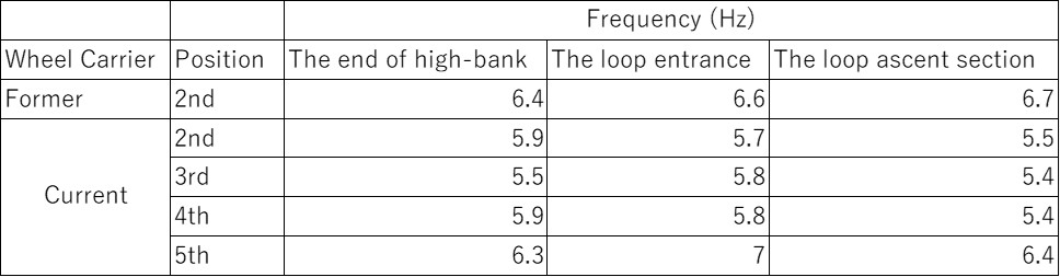 - 旧ホイールキャリアで事故が発生しておらず、旧ホイールキャリアよりも新ホイールキャリアの方が人体の共振周波数に近いこと