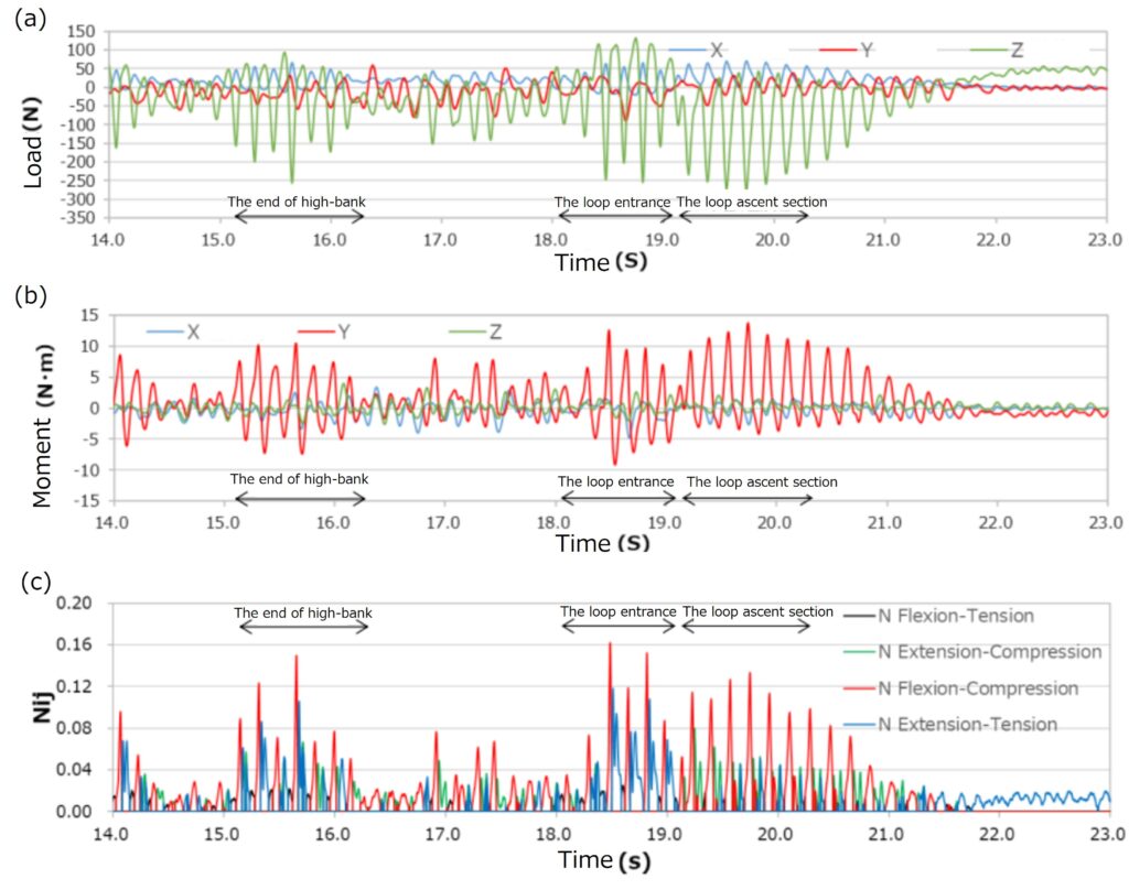 ただし、先述の通り、共振周波数が[7]の値になるのは、背もたれが無く、かつ力が入っていない場合です。また、ループ入口部では、極めて大きな荷重変化が起きています。カーブにおける振動によって背もたれに背中を強打した、という報告もあることから、まずは大バンクでの振動によって身体が背もたれから離れ、その後はループ入口部まで前方傾斜であることから姿勢が戻されず、さらにループ入口部において、人体頭部の共振周波数と同じ周波数で、急激にプラス荷重がかかったことで、負傷に至ったのではないかと考えます。