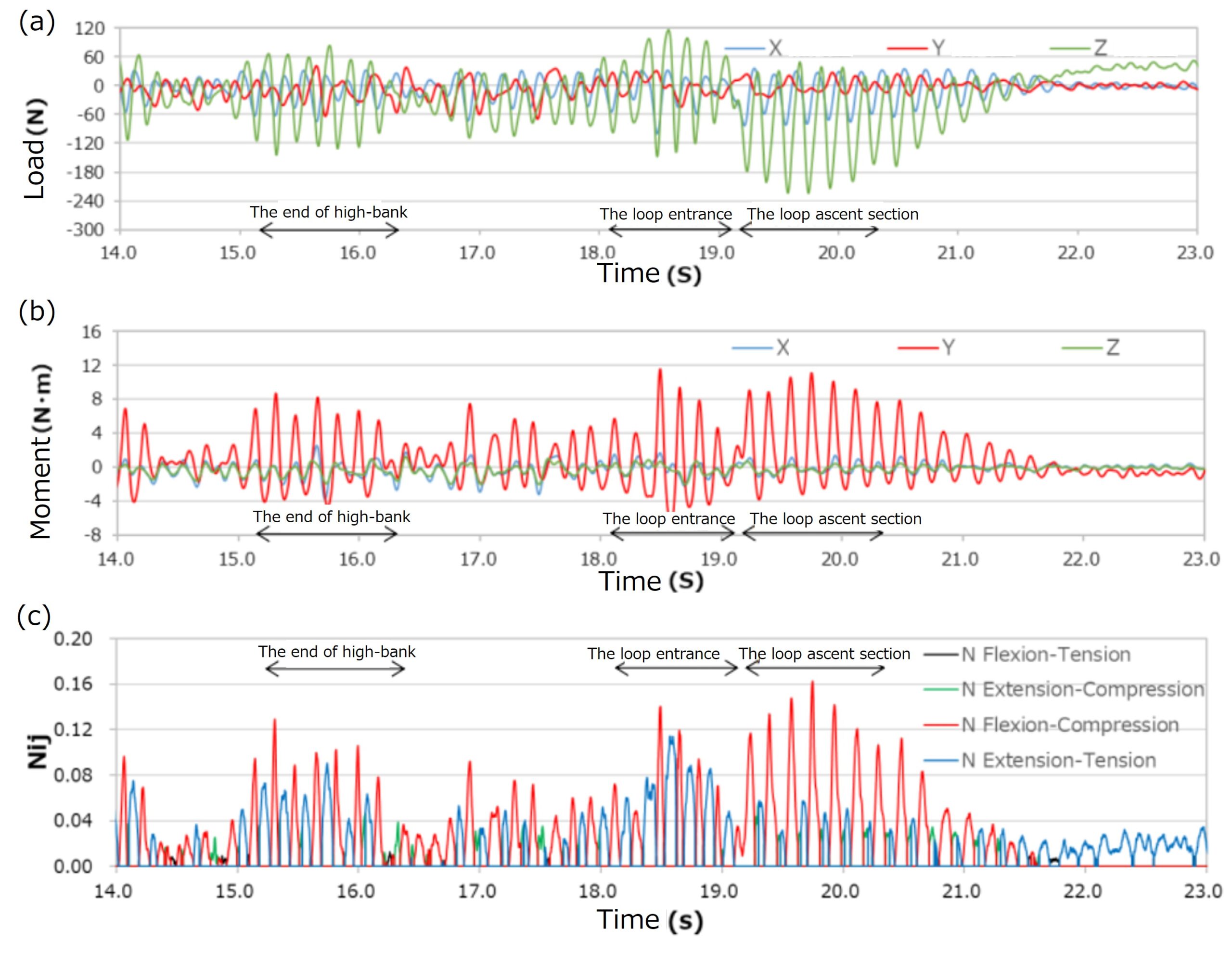 ただし、先述の通り、共振周波数が[7]の値になるのは、背もたれが無く、かつ力が入っていない場合です。また、ループ入口部では、極めて大きな荷重変化が起きています。カーブにおける振動によって背もたれに背中を強打した、という報告もあることから、まずは大バンクでの振動によって身体が背もたれから離れ、その後はループ入口部まで前方傾斜であることから姿勢が戻されず、さらにループ入口部において、人体頭部の共振周波数と同じ周波数で、急激にプラス荷重がかかったことで、負傷に至ったのではないかと考えます。